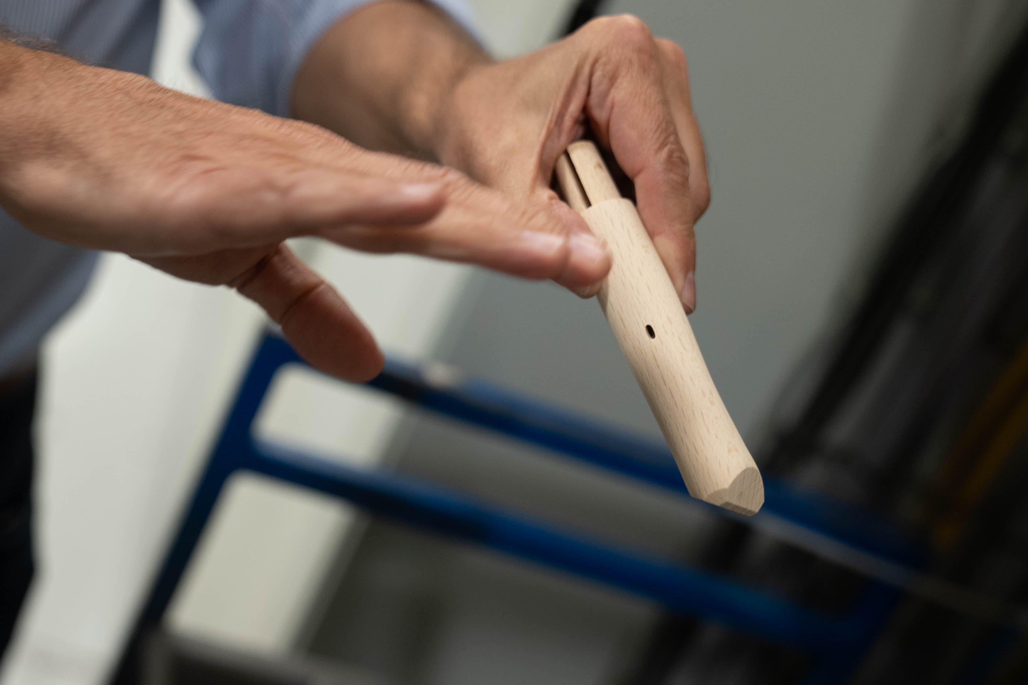 Ogni pezzo di legno viene tagliato su misura per coltelli specifici. Anche pochi millimetri di scostamento possono causare problemi durante il processo di produzione. I blocchi vengono poi inseriti in enormi torni per legno, che utilizzano una sagoma copiativa per ricavare dal legno la forma caratteristica del manico. Questo garantisce che ogni manico sia coerente e di buona qualità.