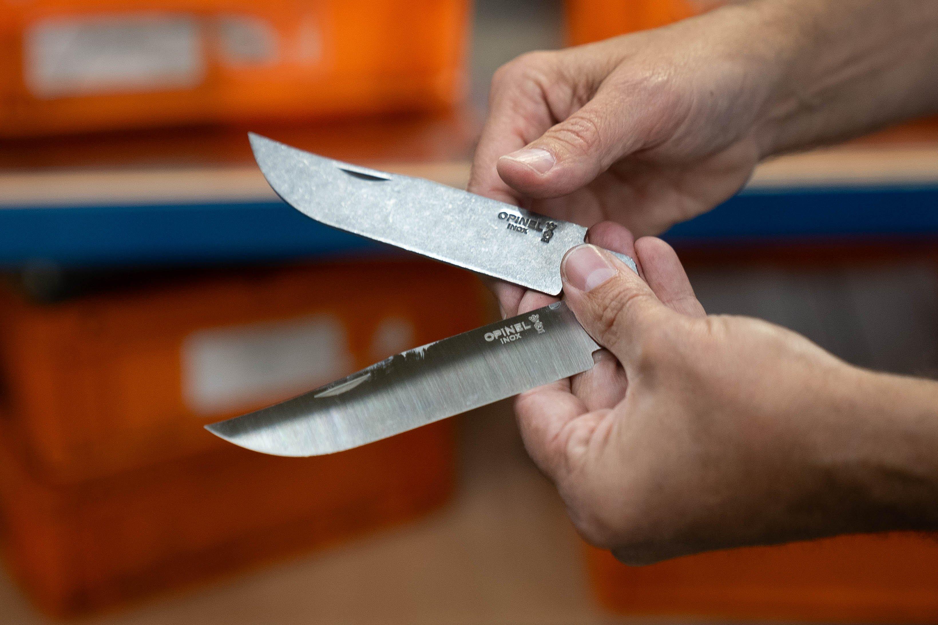 Opinel produce coltelli con lame in acciaio al carbonio o in acciaio inossidabile. L'acciaio al carbonio, una lega di ferro e carbonio, è robusto e mantiene a lungo la sua affilatura, ma è soggetto all'ossidazione. Per ridurre la corrosione, è possibile aggiungere almeno il 10,5% di cromo, ottenendo così un acciaio inossidabile o “inox”. Opinel utilizza da anni questi due tipi di acciaio. Cerca di ottenere una durezza di 57 HRC, trovando un equilibrio tra forza della lama e resistenza alla corrosione. Le lame entrano nel magazzino in forma grezza e vengono poi affilate in lotti.